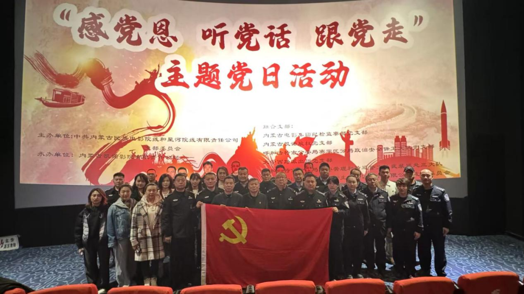 10月31日,民族院线和星河院线党支部联合内蒙古电影集团纪检监察部党支部、凯诺股权党支部、呼和浩特市公安局赛罕区分局政治安全保卫大队党支部、大学西路派出所党支部、呼和浩特市公安局治安管理和特巡警支队武装巡处三大队、大青山野生动物园党支部等七家党支部,共同开展“感党恩、听党话、跟党走”主题党日活动,组织全体党员、预备党员及积极分子集中观看影片《志愿军》,纪念中国人民志愿军抗美援朝出国作战75周年。