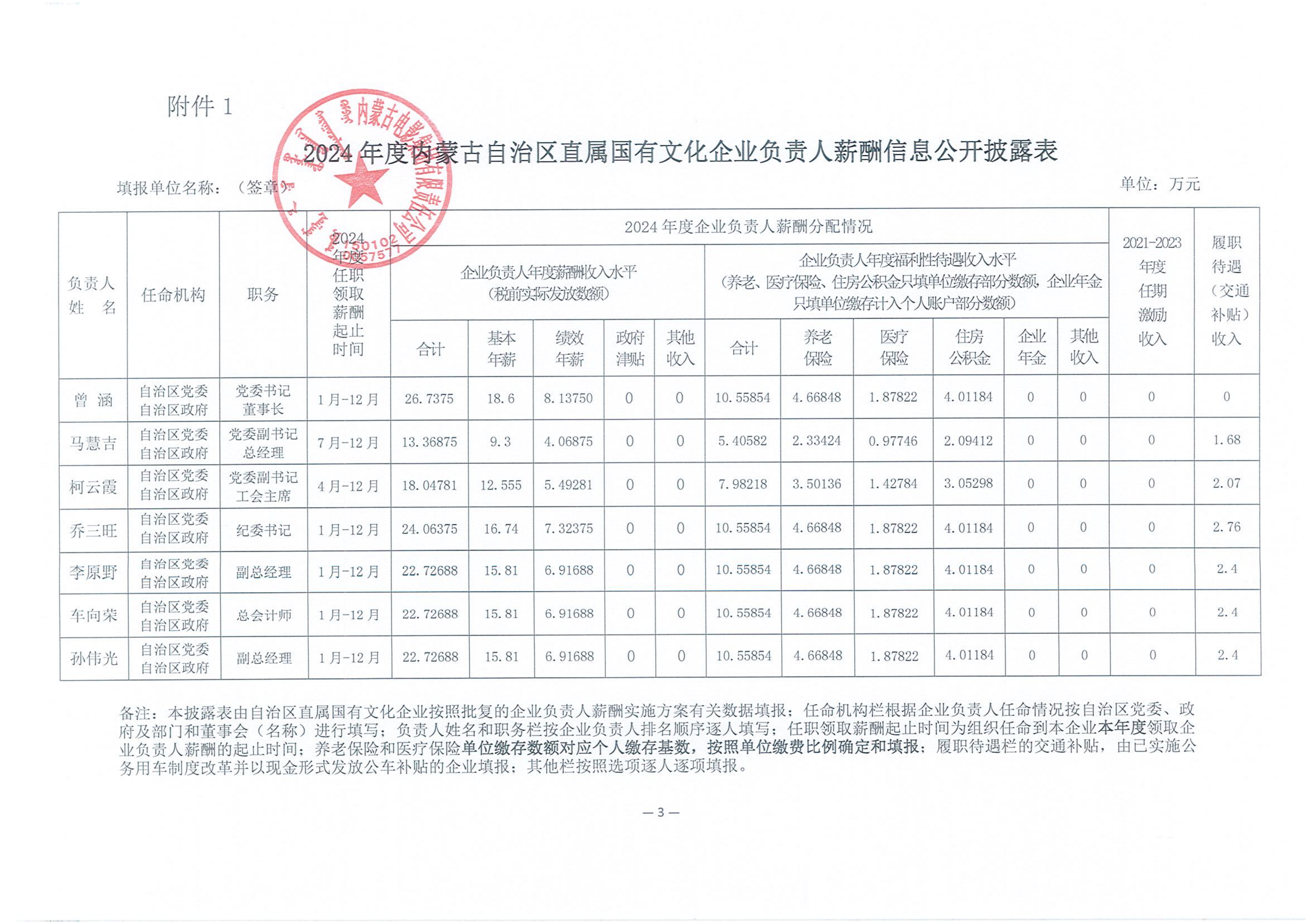 2024年度内蒙古自治区直属国有文化企业负责人薪酬信息公开披露表